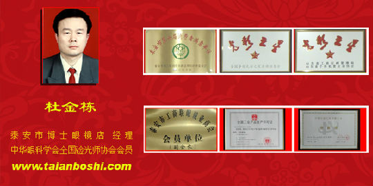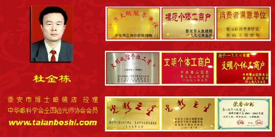 走进泰安市博士眼镜店,宽敞明亮的店堂内,最引人注目的是墙壁上挂着的是一排整齐的铜制奖匾:文明个体工商户,市级模范个体工商户、消费者满意单位、省光彩之星、全国光彩之星——好学求进的杜金栋就是这家眼镜店的当家人。